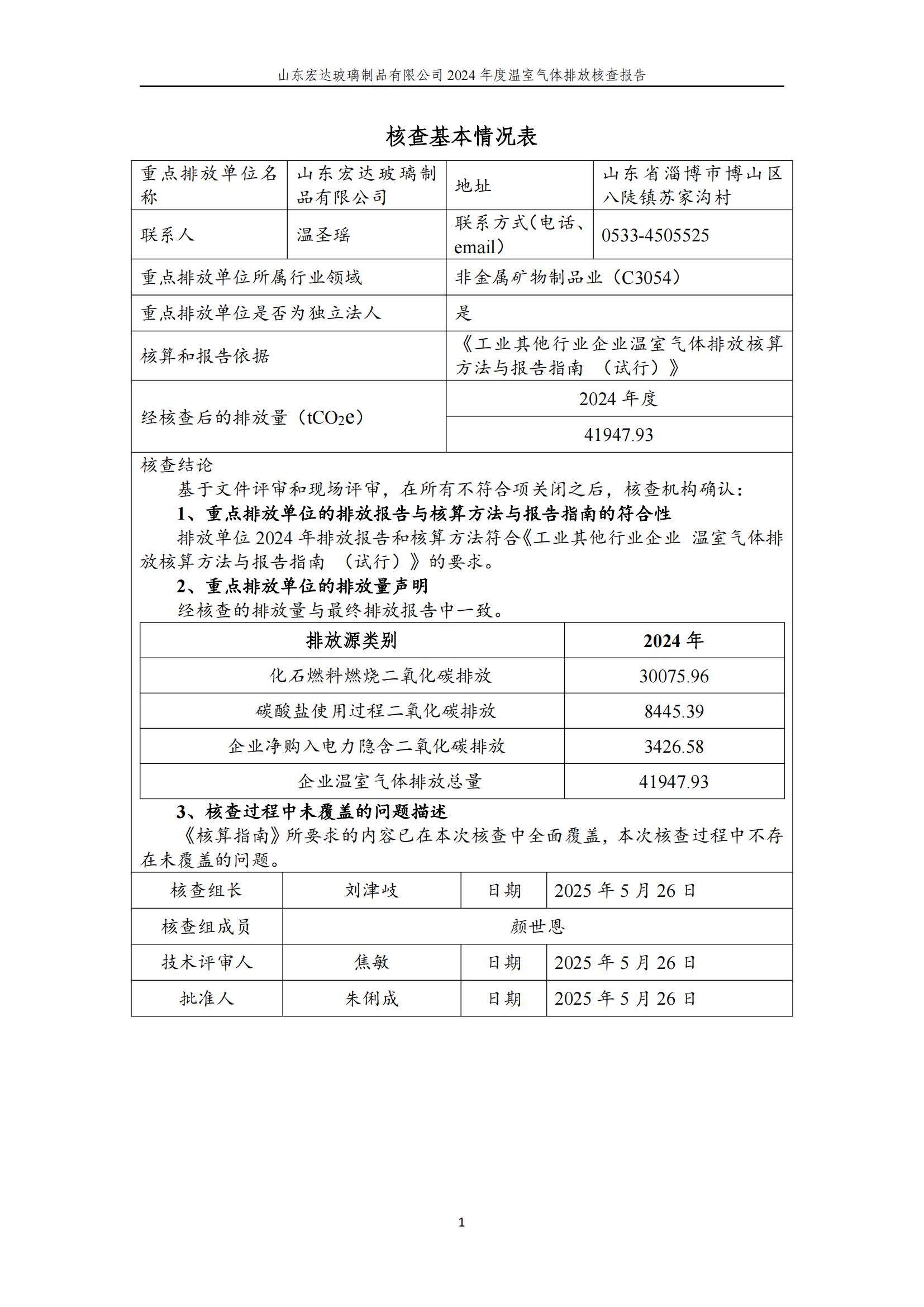 山東宏達玻璃制品有限公司2024年度溫室氣體排放核查報告